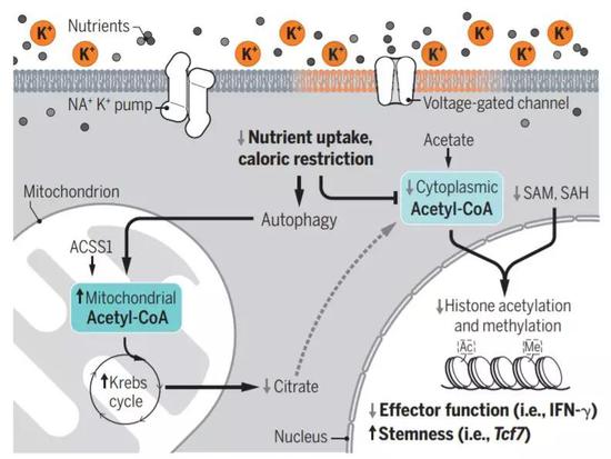 此外,研究人員們還發(fā)現(xiàn)了一個(gè)非常有趣的現(xiàn)象。在鉀離子的影響下 ,T細(xì)胞的表觀遺傳學(xué)修飾會(huì)發(fā)生變化 ,影響T細(xì)胞的分化 。于是 ,這些T細(xì)胞一直被束縛在“干細(xì)胞狀態(tài)”之下,只會(huì)不斷自我復(fù)制,卻無(wú)法順利分化成具有殺傷性的效應(yīng)T細(xì)胞 。這就能夠解釋 ,為啥聚集在腫瘤周?chē)拇罅縏細(xì)胞會(huì)對(duì)病灶無(wú)動(dòng)于衷。