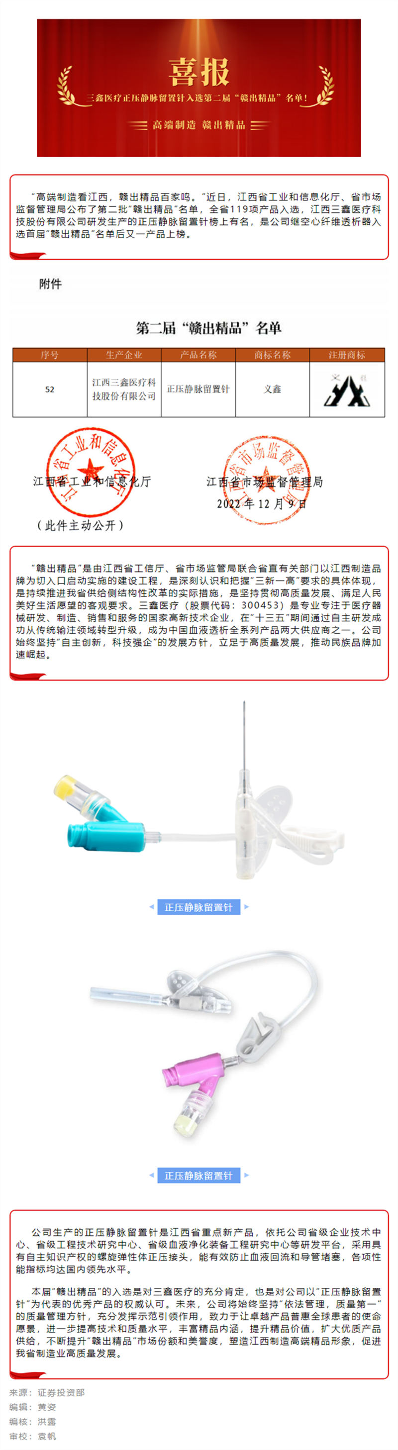 喜訊 | 香港馬買馬網(wǎng)站醫(yī)療正壓靜脈留置針入選第二屆“贛出精品”名單 !